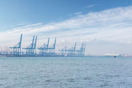 blue sea structure cranes at cargo dock loading in distance felixstowe essex