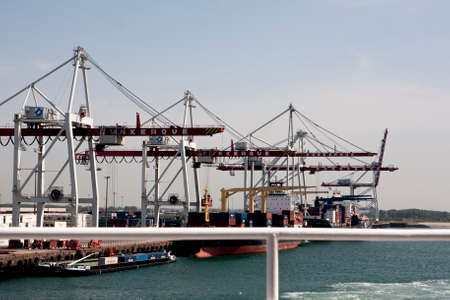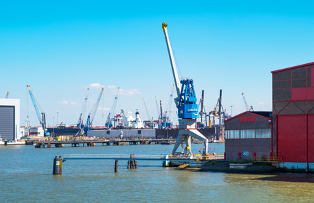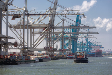 Rotterdam, The Nederlands - July 18, 2016: Goods handling equipment and cargo ships in the main commercial harbor of the city