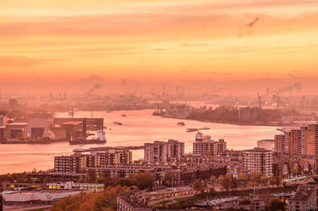Rotterdam, The Netherlands, November 12, 2018: a red sky at sunset over the river Nieuwe Maas and the urban and industrial areas on both sides