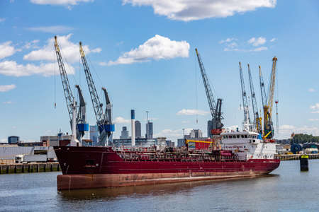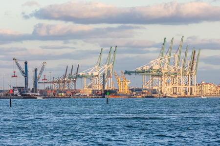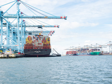 ANTWERP, BELGIUM, SERTEMBER 2018, Harbor cranes containers ships and oil tanker vessel on a sunny morning in the port of Antwerp.