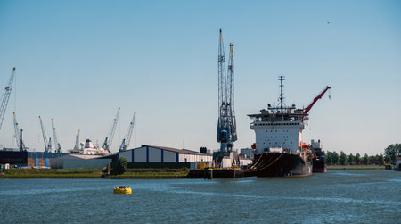 ships with cargo cranes in the harbor of rotterdam netherlands