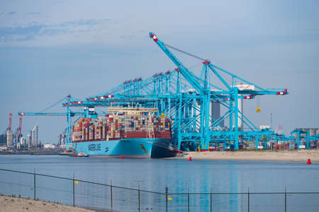 ROTTERDAM - JUNE 1, 2019: Container terminal in the Maas area, a massive man-made westward extension of the Europoort port and industrial facility within the Port of Rotterdam.