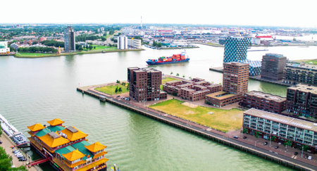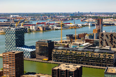 Rotterdam, The Netherlands, November 12, 2018: aerial view of modern residential buildings at Lloydpier with the river Nieuwe Maas and harbour activities in the background