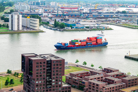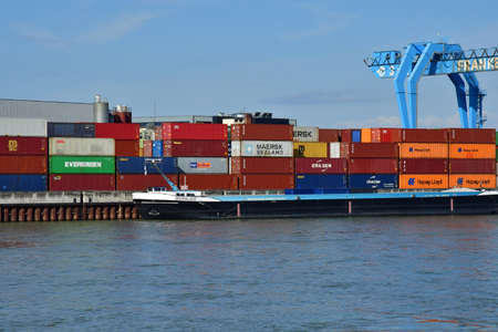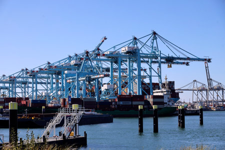 Water transport, export, import and logistics business. Container ship at international commercial harbor of Rotterdam Netherlands, sunny summer day