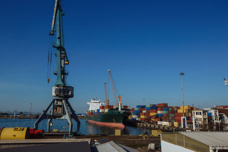 A large cargo ship is docked beside towering cranes at a port. The composition shows the ship, industrial structures, and the water. The scene is illuminated by bright sunlight under a clear, blue sky. This image may be suitable for use in commercial projects related to logistics, shipping, or trade.