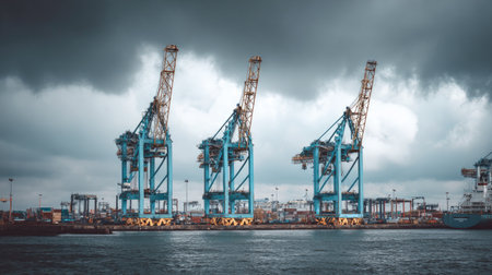 This image captures an industrial harbor scene featuring three towering cranes against a dramatic stormy sky, reflecting a busy maritime environment.