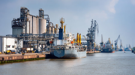 A stunning view of a busy industrial harbor with cargo ships and cranes. The image captures the essence of maritime logistics and trade activity.