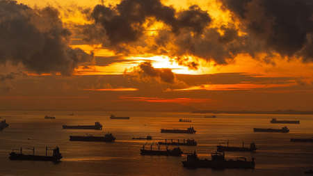 Aerial view of container ships in Singapore Strait. Airplane shot. Cargo ships anchored in the road, waiting to enter the busiest port in region.