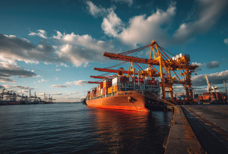 A large cargo ship is moored at a commercial dock. The image features a vibrant blue sky with scattered clouds, contrasted by the orange hues of the cranes and the ship. The composition suggests a bustling environment, ideal for illustrating concepts related to shipping, logistics, and global commerce.