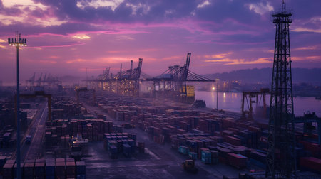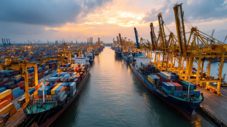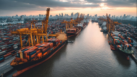 Vibrant aerial view of a bustling container port at sunset, showcasing vibrant colors of stacked containers, cargo ships, and industrial cranes in action.