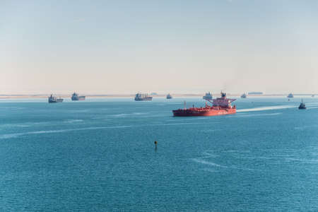 Suez, Egypt - November 5, 2017: Commercial ships southbound through the Great Bitter Lake and wait in line at anchor. This is where the North and South convoys pass.