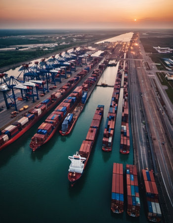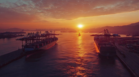 An aerial view of a busy shipping port with cranes loading cargo containers onto massive freight ships at sunrise
