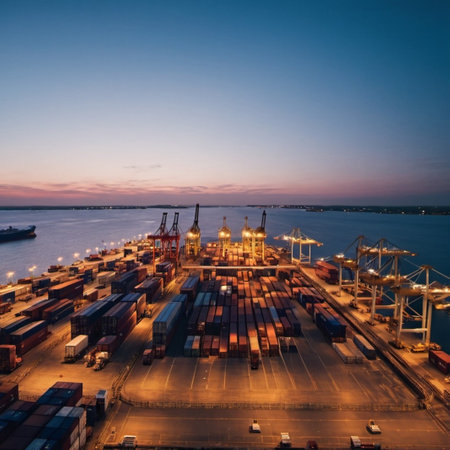 A dynamic aerial view captures a busy container port at dusk, featuring illuminated cargo ships and towering cranes bustling with activity.