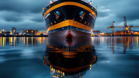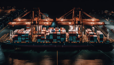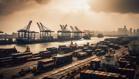 Container ship unloading heavy cargo at dusk generated by artificial intelligence