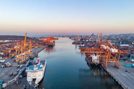 Aerial view of the Port Harbor in Odessa with moored ships of different purposes, Ukraine. Top view