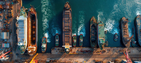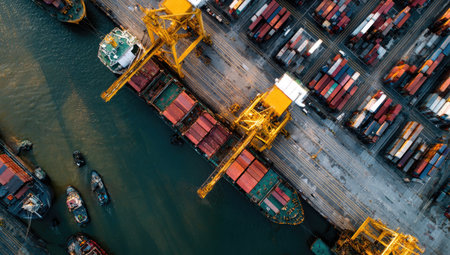 Aerial view of industrial port servicing shipping containers and cargo ships in global commerce
