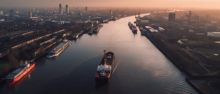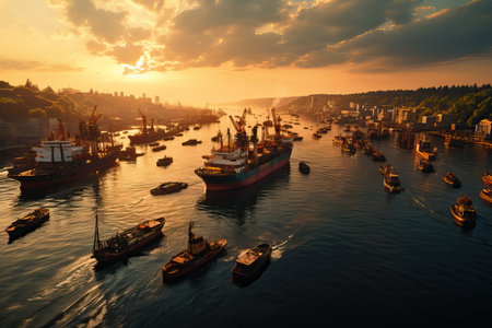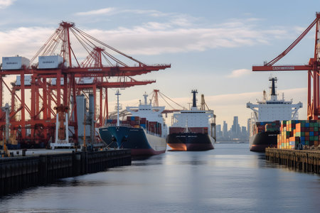 A bustling port, with cargo ships and cranes, showcasing the global trade and commerce that drives the economy of a commercial city. Transportation and shipping concept. Copy space