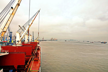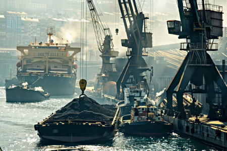 Ship cranes towering over cargo barges loading coal onto massive bulker. Industrial harbor scene featuring cargo ships and towering cranes loading coal onto vessels, maritime commerce and industry