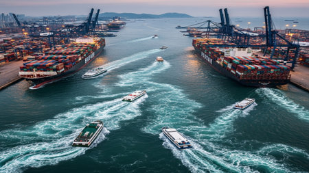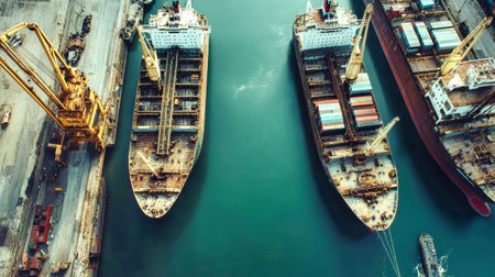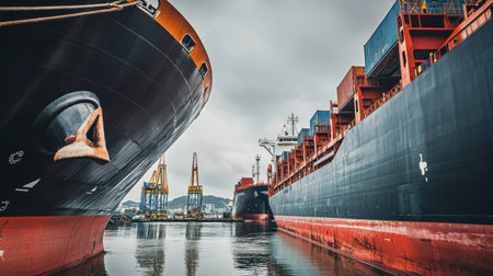 This image showcases cargo ships docked at an industrial port, highlighting maritime transport and logistics in a busy harbor environment.