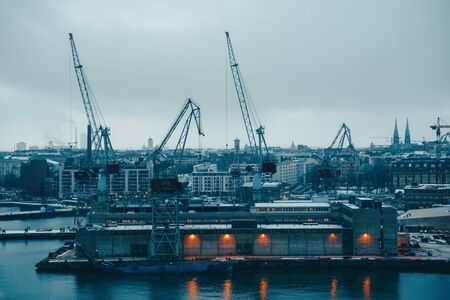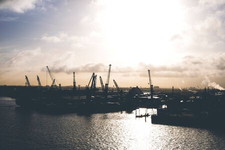 Industrial port activity: Heavy machinery and containers in a bustling seaport.ariel view on the sunset