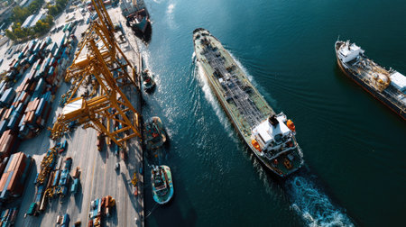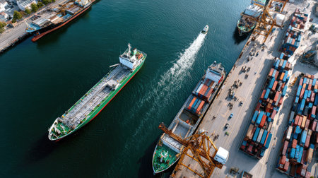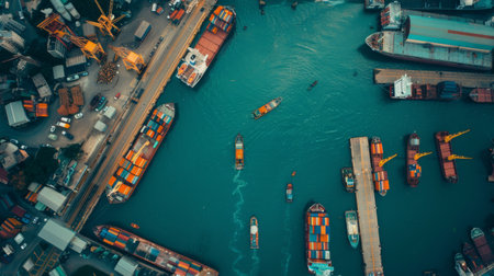 An overhead view reveals cargo ships docked at a harbor. Containers are stacked, indicating import and export activities. The scene is lit by natural light, showing various colors. This image would be suitable for commercial projects illustrating logistics, transportation, or global commerce.