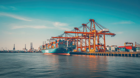 A large container ship is seen docking at a bustling harbor, surrounded by towering cranes and various maritime structures beneath a clear sky and calm waters.