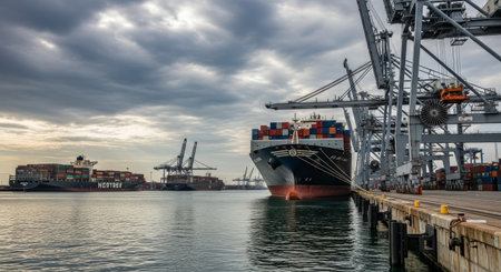 Container ship at a busy port under a dramatic cloudy sky. Cargo handling and shipping in a modern seaport. Global trade and logistics concept.