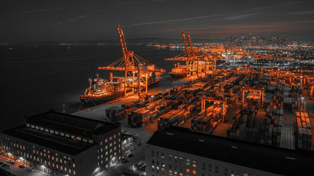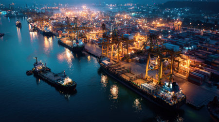 This captivating aerial image showcases a bustling port during the nighttime, highlighting massive cranes and illuminated ships. The vibrant city lights reflect beautifully on the water, emphasizing the significant activity at this industrial hub.