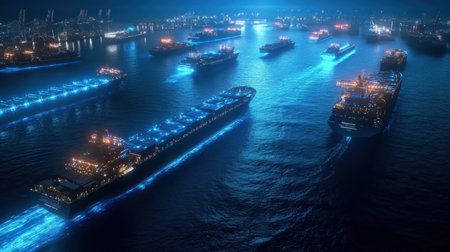 A smart city harbor with autonomous cargo vessels navigating through neon blue holographic shipping lanes