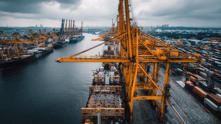 A stunning aerial view showcases cargo ships docked in a busy port area, highlighting the cranes and the bustling industrial landscape under a dramatic cloudy sky.