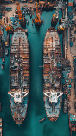 Capture an aerial view of a busy shipyard showcasing various vessels under construction, cranes towering, and intricate industrial activity below.