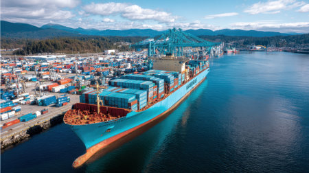 A vibrant aerial shot of a massive cargo ship at port, surrounded by stacks of colorful shipping containers, with majestic mountains and a bright sky in the background.