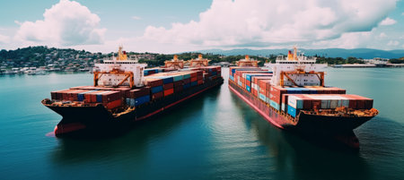 Panoramic banner with industrial cargo container ships in calm sea, AI generative freight transportation horizontal border