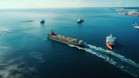 An aerial perspective of multiple cargo vessels on the open water, showcasing naval architecture against the backdrop of a clear sky with fluffy clouds