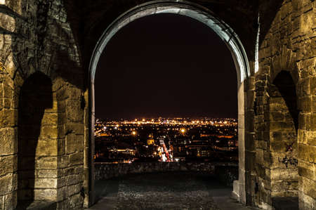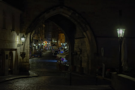 Prague, Czechia - 02.17.2022: View through Mala Strana Tower Bridge arch in the dark night on the Charles Bridge. Center without people. Beautiful historical buildings in central european capital.