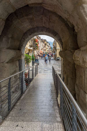 Aosta, Italy - July 20, 2014: Tourists exploring old Roman ruins in Aosta