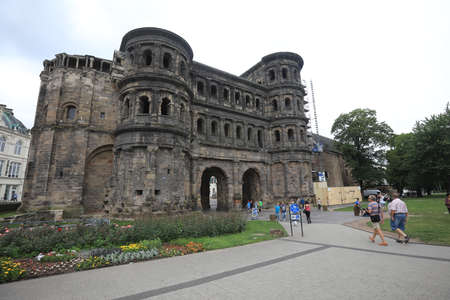 TRIER, GERMANY - AUGUST 22,2014 - The Porta Nigra. Trier lies in a valley between low vine-covered hills of red sandstone in the west of the state of Rhineland-Palatinate.