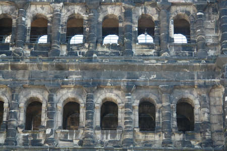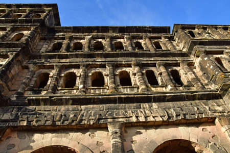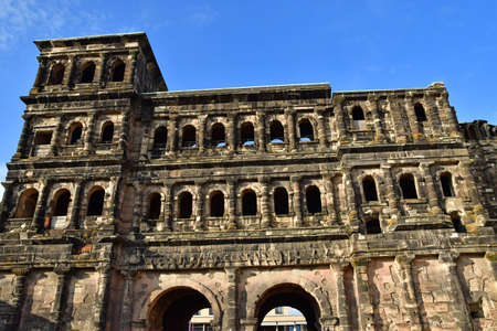The Porta Nigra Black Gate in Trier city, Germany. It is a famous large Roman city gate. Front view.