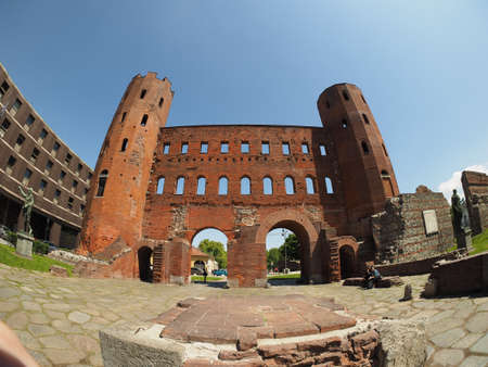 TURIN, ITALY - CIRCA MAY 2019: Porta Palatina (Palatine Gate) ruins with fisheye lens
