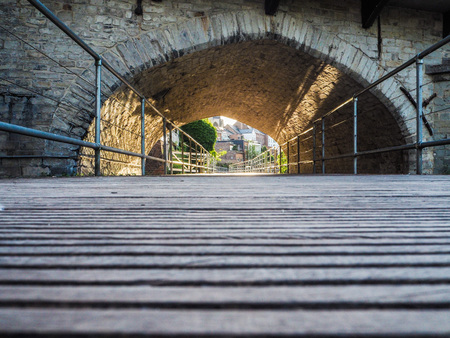 Sunset shinning on the wooden path winding through the pillars of the old Gothic Fontein Bridge crossing the river Dyle in Mechelen, Belgium