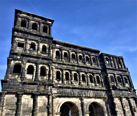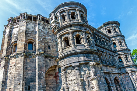 Impressive porta nigra gate in front of blue sky in Trier