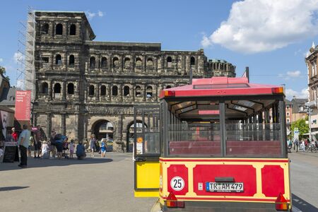 Trier, Germany - July 06, 2018: Sightseeing bus in front of the Ancient Gate of Porta Nigra (Black Gate) in the center of Trier.