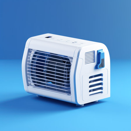 This modern portable air conditioner unit stands out against a bright blue background, perfect for enhancing indoor comfort during warm months. Ideal for home or office use.