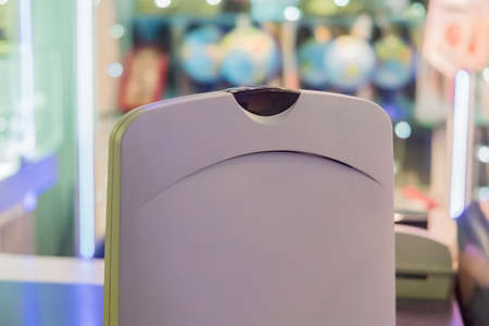 Indoor air purifier of white color close-up on a white background. Dust and allergy cleaner in the house.