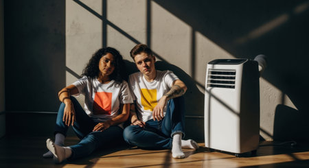 A woman and a man sit on the floor next to a portable air conditioner, seeking comfort from intense summer heat. Essential household appliance for staying cool.