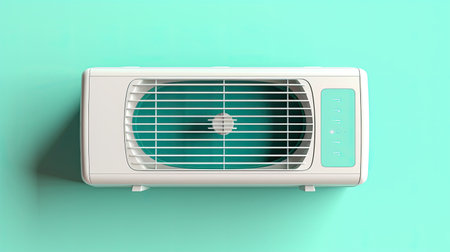 A sleek portable air conditioning unit stands against a vibrant teal background, providing efficient cooling for homes and enhancing comfort in any space during hot summers.