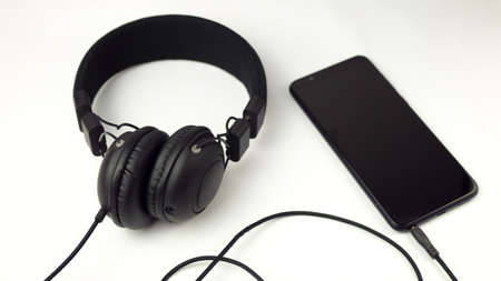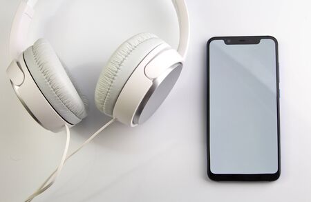 Mobile phone on a white background. White headphones on the phone. Close-up.