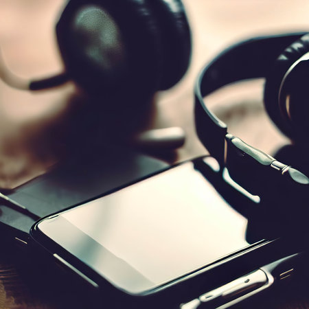 Mobile device, CD, cassette, USB flash drive, studio headphones. Dark wood backdrop