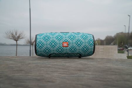 GENEVA, SWITZERLAND - APRIL 4, 2019: JBL bluetooth speaker by the lake on the skate ramp