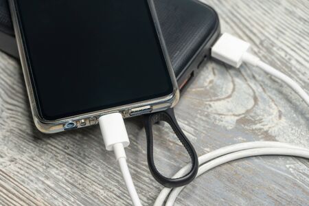 Smartphone connected to a power bank. Way to charge the battery of a mobile phone without connecting to electricity. Tools for telecommunting. Concept wireless technology